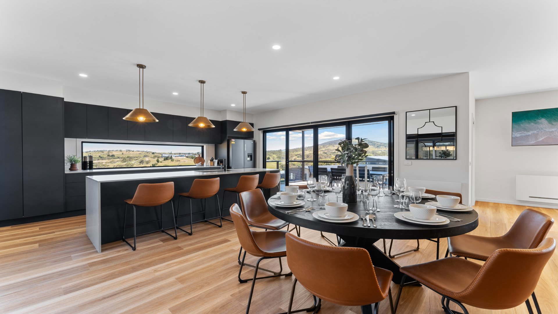 Moving upstairs, an industrial-style staircase and feature rustic brick wall guide your ascent. The pendant ball light above creates a captivating ambience as you venture into the open plan layout. Here, a modern kitchen, open plan living area, and a stylish round 8-seater dining area seamlessly combine to create an inviting atmosphere. Off the kitchen, a spacious balcony with expansive views of the mountains awaits, providing a perfect spot to relax and enjoy the beautiful sunsets. This setup is ideal for socialising, preparing meals, and enjoying shared moments with loved ones.