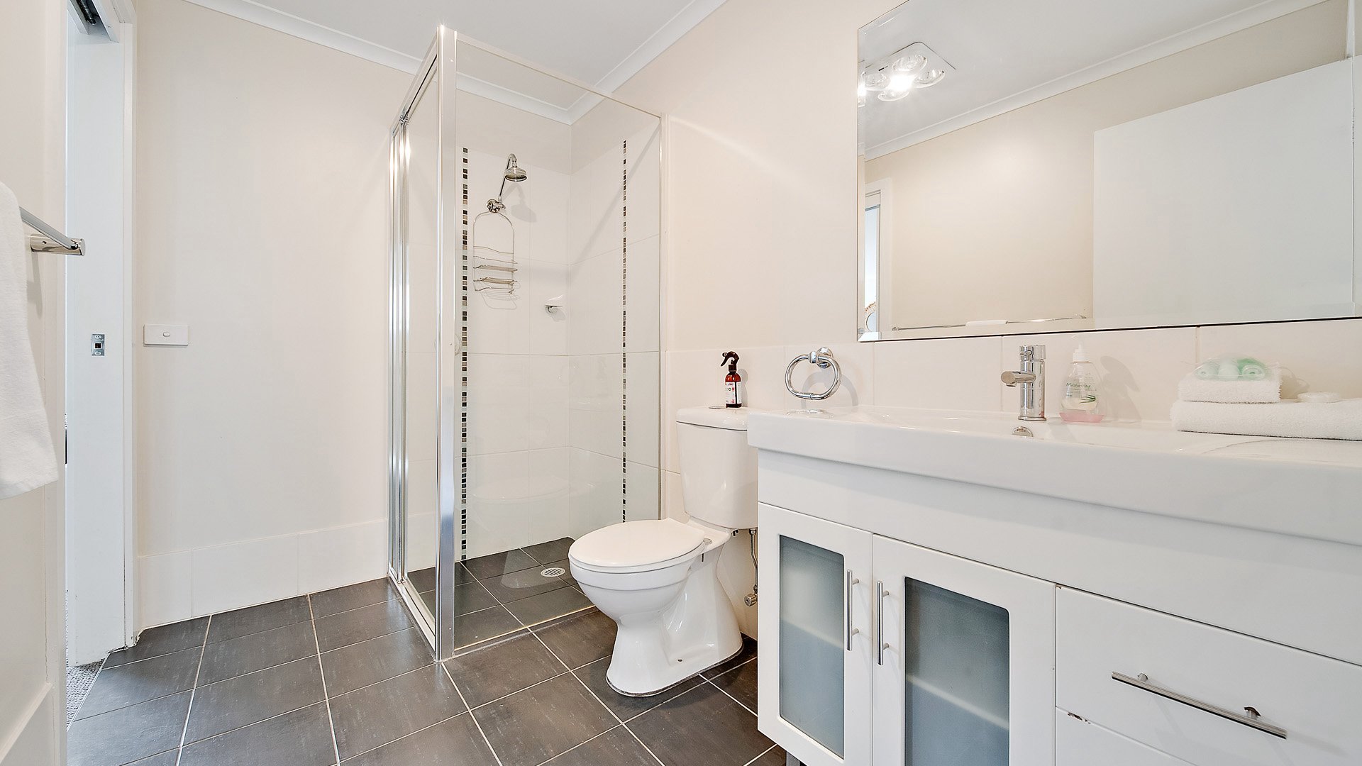 Jasper 4 has two bathrooms, both with shower vanity and toilets that service the three bedrooms with Bedroom 1 and 2 on the entry lower level that utilise the jack and jill style bathroom and Bedroom 3 on the upper level which is serviced by the smaller upstairs bathroom.
