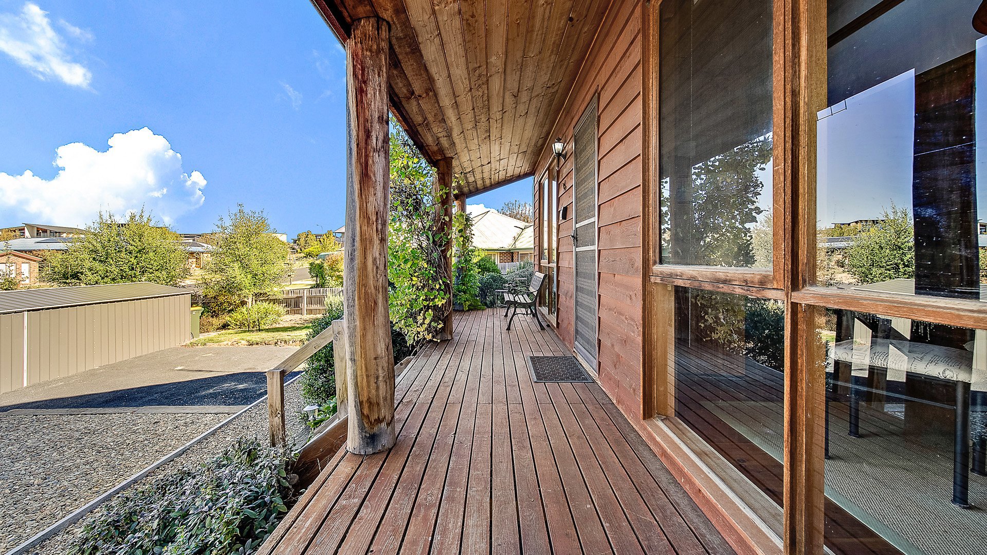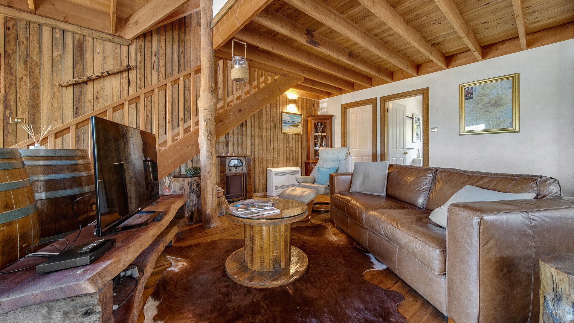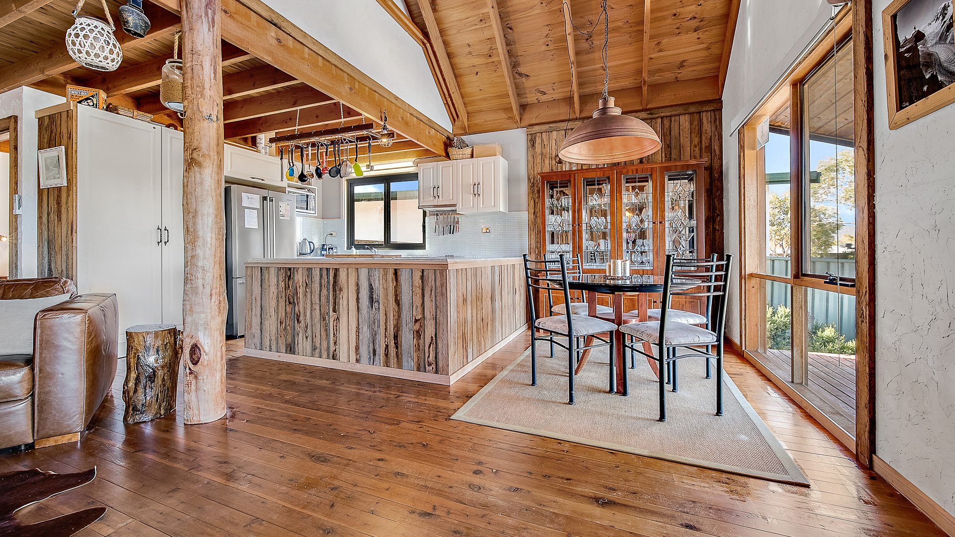 The warm and inviting living, dining, and kitchen area on the ground floor features rustic touches that provide a cozy atmosphere. The ground floor also includes the bathroom and laundry, complete with a freestanding bath to soak away the day's exertions. In the rear yard, you'll find a sizeable firepit and sitting area where you can unwind and relax after an adventurous day at the mountains or lake. It's important to note that wood is not supplied.