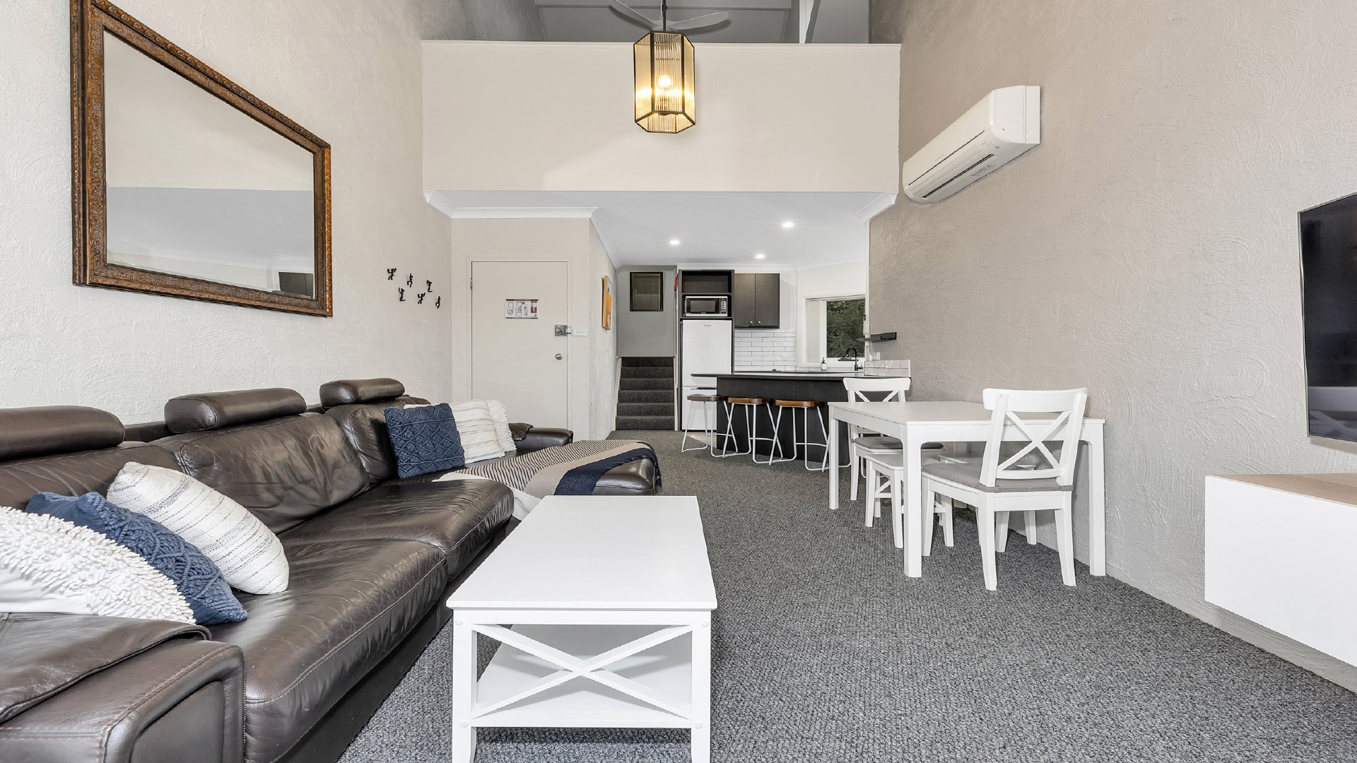 Upstairs on the second level, you'll discover a well-appointed combined bathroom and full laundry, adding ease and convenience to your stay. This level also includes a cosy bedroom with a bunk bed and tri-bunk, perfect for kids, a second couple or additional guests.
