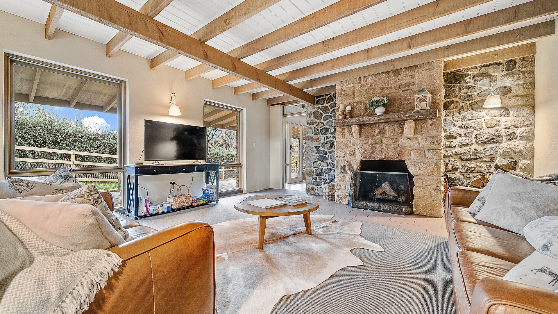 This delightful property offers four gorgeous bedrooms with two queen beds, king single bunks and two king single beds spread over two levels. The open plan kitchen and dining area is the perfect spot to gather your group for a lovely home-cooked meal prepared using the Smeg appliances, overlooking the large back garden and local countryside whilst staying toasty warm by the combustion fireplace. The separate living area boasts an incredible stone fireplace and cozy couches, making it the perfect spot for lounging around reading a book, playing board games or watching Netflix.