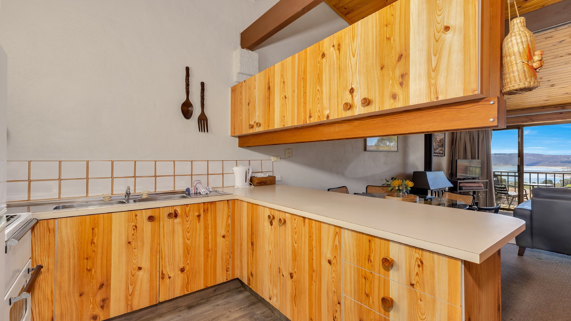 The open-plan kitchen, lounge, and dining area in Snowbird 1 provide a comfortable and inviting space for guests to relax and unwind. The fully equipped kitchen boasts appliances, including a stove, oven, microwave, and fridge, making meal preparation easy. The lounge is tastefully furnished with comfortable couches, a combustion fireplace (firewood not provided), and TV, creating a warm and cozy area. The sweeping views from the couch overlook the lake and surrounding area, making it the perfect place to relax. The balcony is also an ideal spot to enjoy a morning coffee or an evening drink whilst cooking on the BBQ, while taking in the beautiful views.