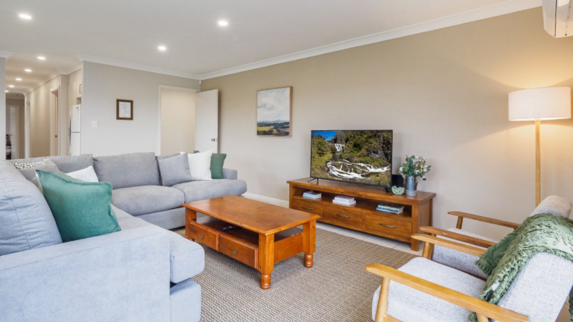 The Large Flat Screen TV is central to the whole loungeroom, so can be enjoyed from multiple vantage points in the room, while the reverse cycle air-conditioning unit provides a comfortable room temperature in the living/dining/kitchen areas for Winter and Summer guests alike.