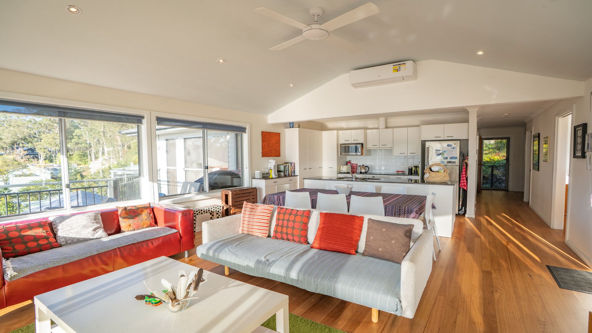 Set high in the trees near Bouddi National Park with stunning uninterrupted views over Brisbane Water. This comfortable house is perfect for a family or couples' getaway with a fully equipped kitchen, open plan living and dining and a large deck with amazing water views.